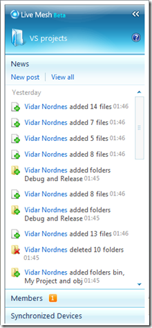 Microsoft released Live Mesh (beta) to the public April last year. I’ve only been using it a couple of days, but I wish I had noticed this before! On www.mesh.com the slogan is “Sync, share, and access the information you care about – wherever you happen to be.”. I think this explains most of it. Live Mesh is a service from Microsoft that you can connect to either using your browser (from anywhere in the world), or using an application installed on your PC. If you install this application, it integrates with windows explorer. All Mesh-folders have a blue folder-icon. If you got a folder you want to share with mesh, you just right-click it and choose “Add folder to Live Mesh”. You can also add permissions on this folder so your friends can get access to it. I’ve tested this with a folder I call “VS projects”. On my spare time I’ve been working a bit with an IRC client. I wanted to share the source code with Jan Leon, so I gave him permissions to the folder, and 30 seconds later, he had it on his desktop without doing ANYTHING. Live Mesh did the synchronization automatically.