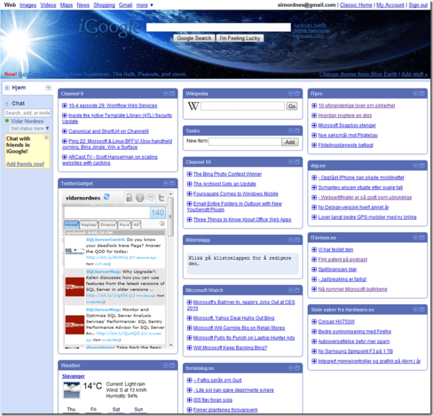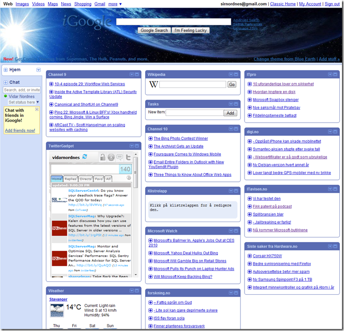 Google is the “one and only” when it comes to search, but Google also offer a lot of other features! Jon Kristian wrote about Google Wave which is going to be released this year. In addition to this they got for example iGoogle which is a very good and customizable start page. Here’s a screenshot of my iGoogle, were I’ve got news, twitter, search, tasks etc.