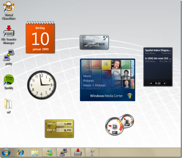So, over to the new features. Most of your are probably familiar with “gadgets” in Vista. In Windows 7 you still got gadgets but they’re not locked to the sidebar. You can drop them wherever you want on the screen (as shown on the screenshot). This is of course just to show you. I normally don’t use any gadgets 🙂
