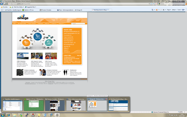 One of the features I’m a big fan of is the new taskbar. Instead of having a taskbar just for opening applications, you can now hover for example the IE-icon, and then get a preview of all your tabs. If you click any of them it opens IE in the correct tab. This also includes all other applications. By using the right-click option “pin this program to taskbar”, you can add applications to it. I’ve pinned putty (which is a SSH-client). If I click it, and the application isn’t opened, it will start it. Pretty neat, especially with the preview functionality.