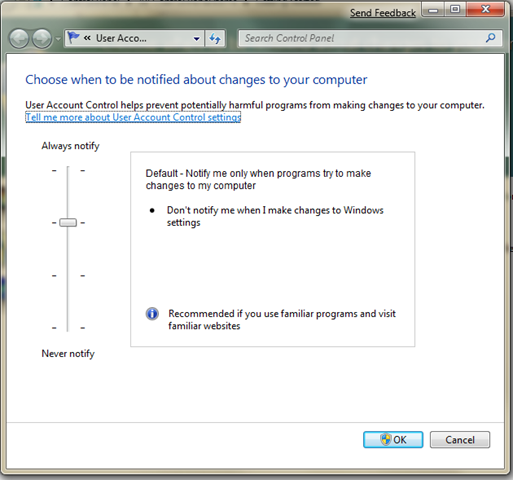 UAC (User Account Control) is something that have annoyed many people in Vista. I think UAC is a good idea, but it should warn you about things that really matter, and not EVERYTHING you do. I myself have set it to the “Shut up and let me do what ever I want because I (think I) know what I’m doing“-mode. In Vista there was only on and off, but in Windows 7 there’s 4 settings.